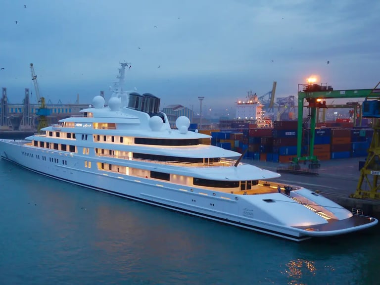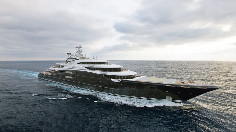The yacht measures 115 meters in length and features two helipads as well as a garage filled with luxury “toys” for billionaires.